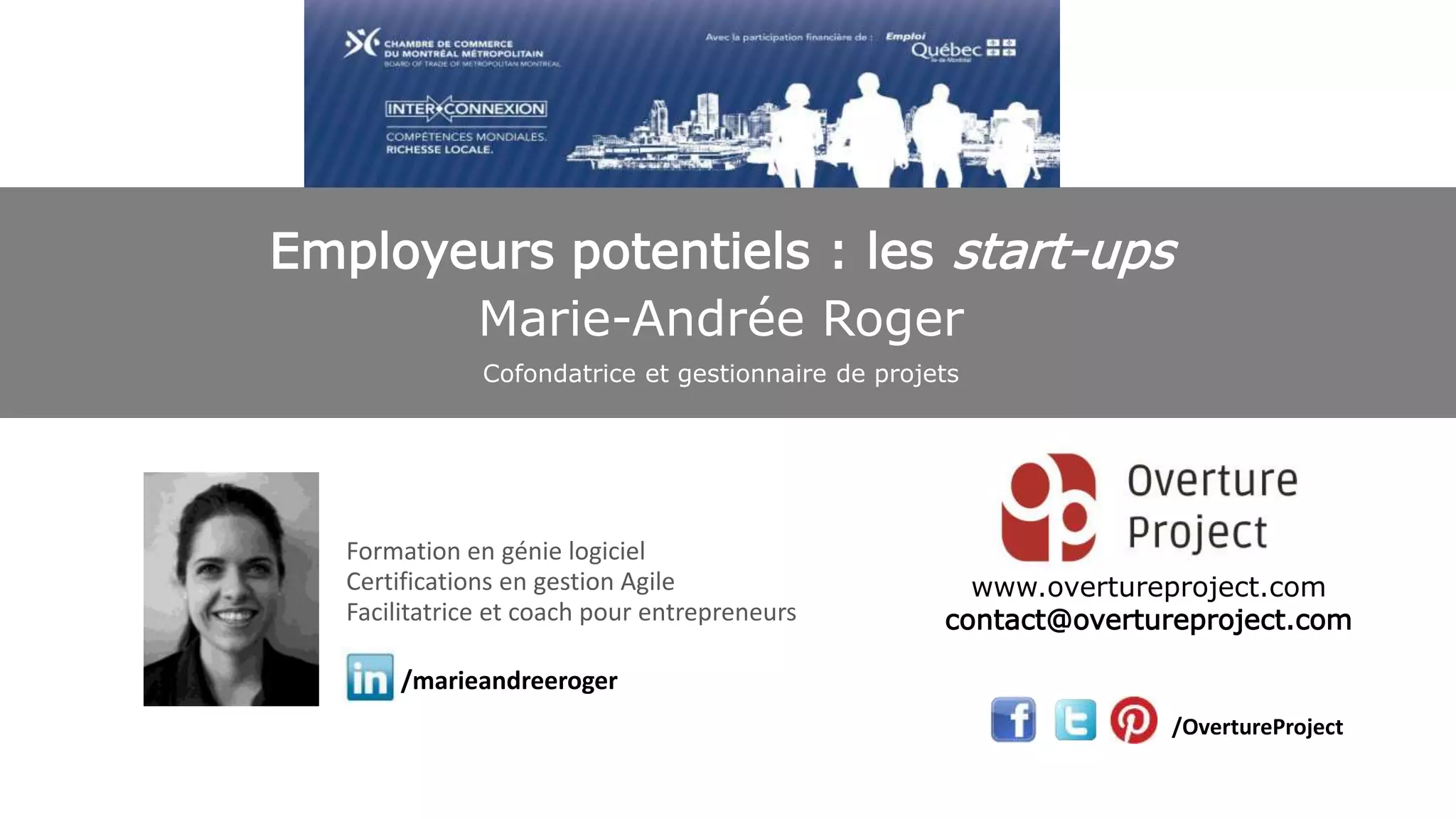 Marie-Andrée Roger, cofondatrice et gestionnaire de projets chez Overture Project, met en avant l'importance de l'entrepreneuriat et de l'innovation au Québec, notamment à Montréal. Elle souligne que le milieu technologique est accueillant pour les idées diverses et que les travailleurs doivent être flexibles, ouverts et prêts à apprendre. Roger offre également des ressources pour aider ceux en redirection de carrière ou les entrepreneurs à s'intégrer et à réussir.