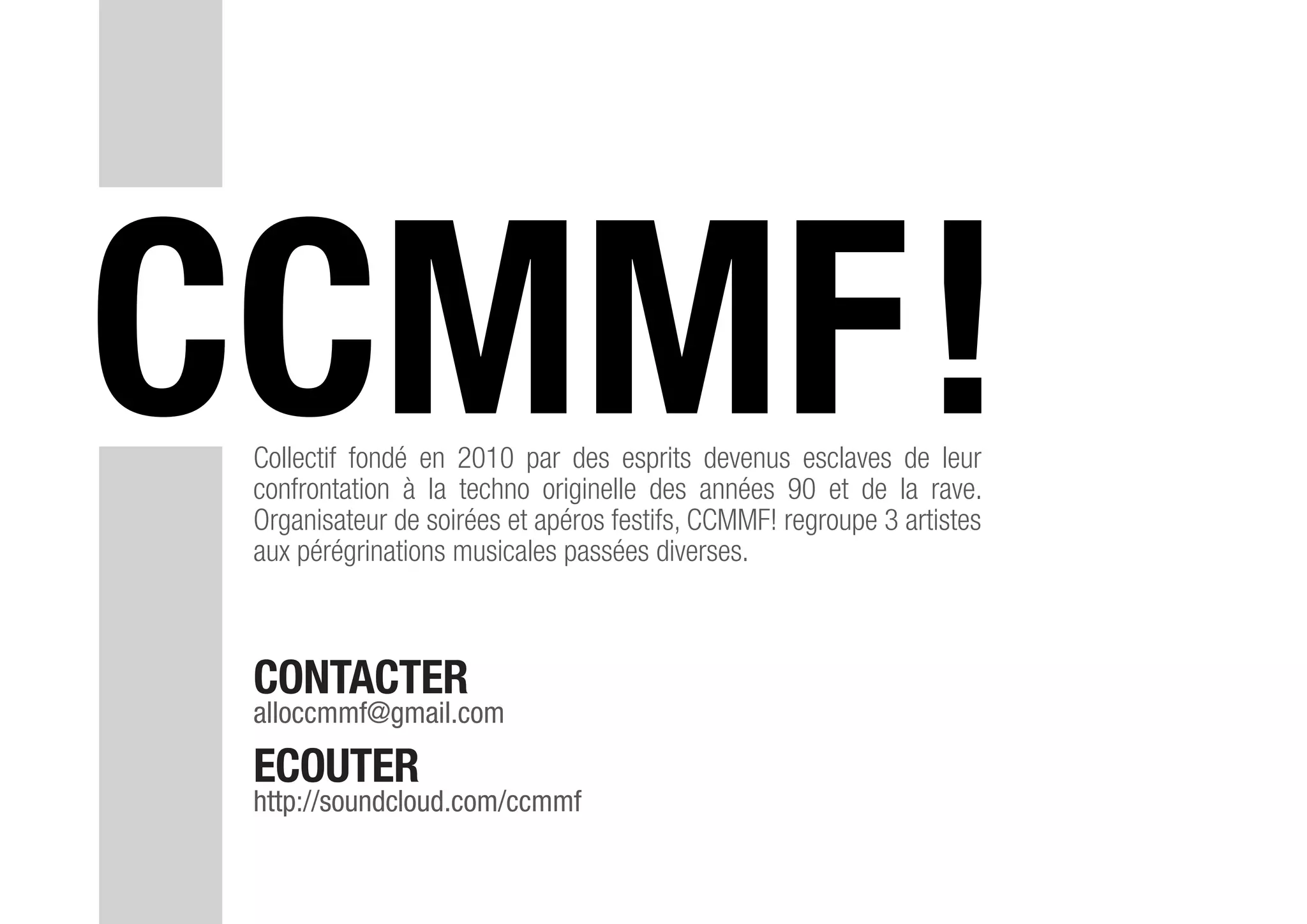 Le collectif ccmmf!, fondé en 2010, regroupe trois artistes influencés par la techno des années 90 et organise des événements festifs. Parmi ses membres, Stiff, Paul Peanuts et Piero Geiger, chacun ayant une carrière diversifiée dans la musique techno. Le collectif se produit dans divers clubs parisiens et internationaux, avec des invités de l'écosystème techno.