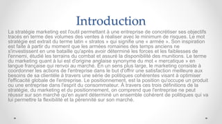 Le document aborde les stratégies de marketing essentielles pour les entreprises afin d'atteindre leurs objectifs de vente tout en minimisant les risques. Il présente des méthodologies d'analyse comme SWOT, l'utilisation de diagrammes et des recommandations pour améliorer l'efficacité marketing et répondre aux besoins des clients. Enfin, des solutions innovantes comme l'automatisation du marketing et des études de marché approfondies sont proposées pour optimiser la performance des entreprises sur le marché.