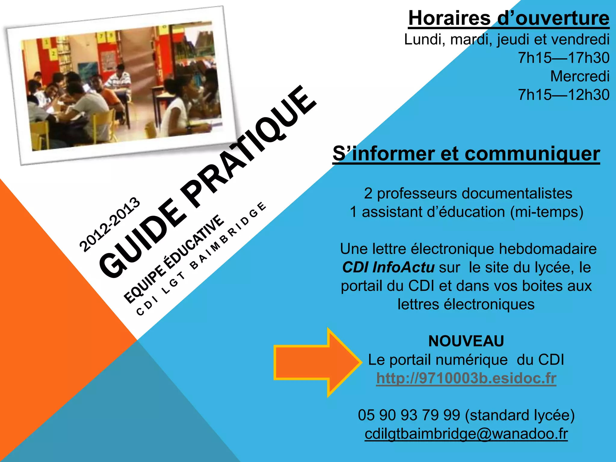 Le document présente les horaires d'ouverture et les services du CDI, ainsi que les modalités d'emprunt pour étudiants et personnels. Il décrit également le catalogue des documents disponibles, les expositions, et les ressources en ligne accessibles aux utilisateurs. Enfin, il met en avant les activités et les soutiens pédagogiques proposés tout au long de l'année.