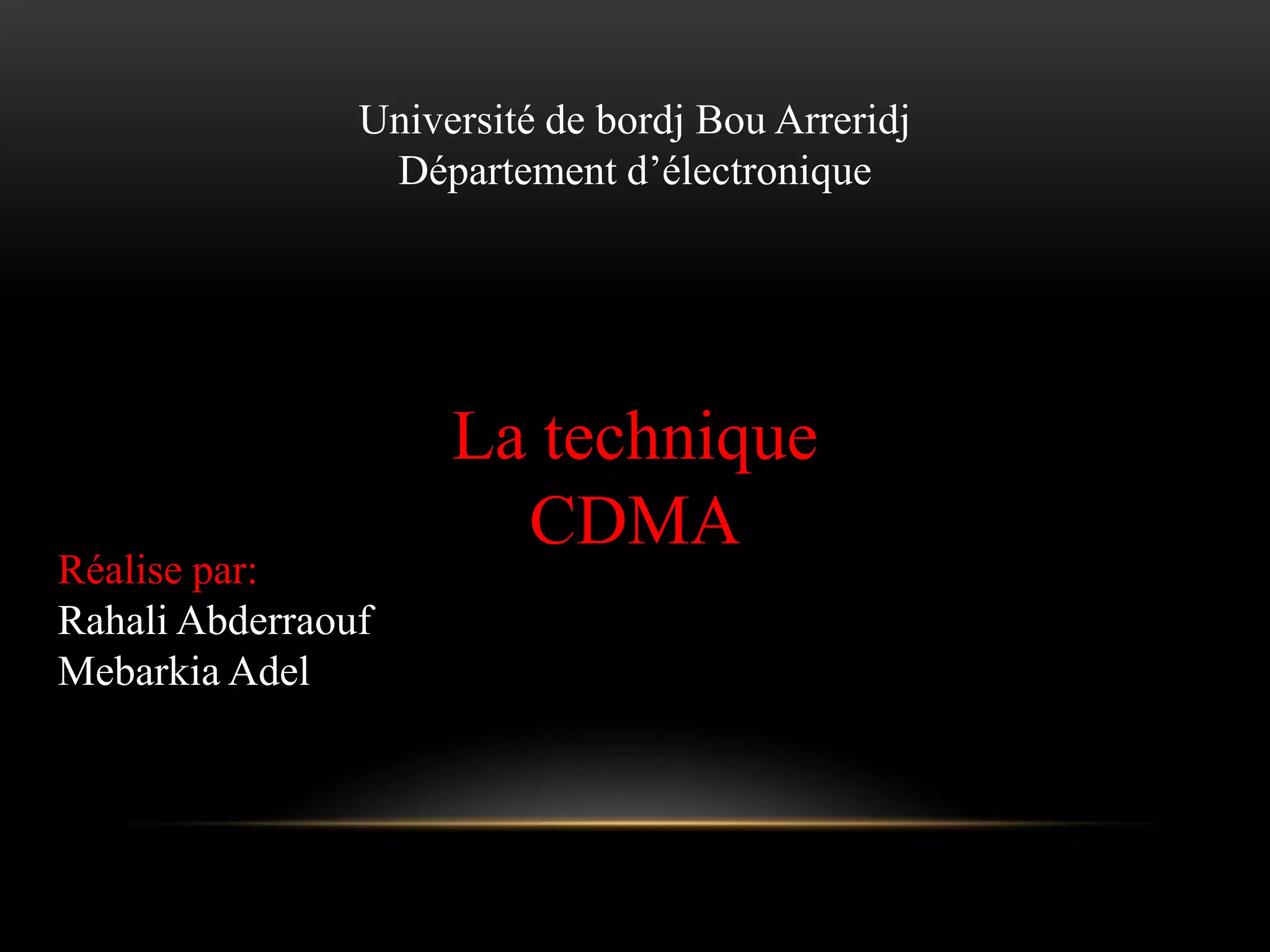 Le document présente la technique de l'accès multiple par répartition de code (CDMA), qui permet à plusieurs utilisateurs d'accéder simultanément à la même bande de fréquence grâce à l'étalement de spectre. Il aborde également les autres techniques d'accès multiples comme FDMA et TDMA, ainsi que les avantages spécifiques de CDMA, notamment une plus grande capacité et une meilleure résistance aux interférences. En conclusion, CDMA est une technologie performante en termes de rapidité et de qualité.