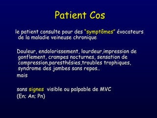 Le document présente des informations sur la classification CEAP de la maladie veineuse chronique, détaillant les différentes classes de symptômes et de signes cliniques associés. Il met en évidence l'importance croissante des patients asymptomatiques (c0) dans les études épidémiologiques et décrit plusieurs tableaux cliniques tels que le syndrome pré-variqueux et la phlébopathie fonctionnelle. Des statistiques concernant la prévalence des symptômes veineux dans différentes populations sont également fournies.