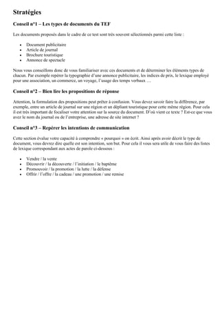 Le document présente une série d'exercices et de stratégies d'apprentissage pour un test de compréhension de documents de la vie quotidienne. Il est structuré en plusieurs sections, chacune axée sur différents types de documents tels que des annonces, des messages vocaux et des extraits radio, avec des objectifs spécifiques pour aider à identifier la nature, la fonction, et l'intention des messages. Des conseils pratiques sont donnés pour réussir chaque type d'exercice, ainsi que des exemples pour faciliter la compréhension.
