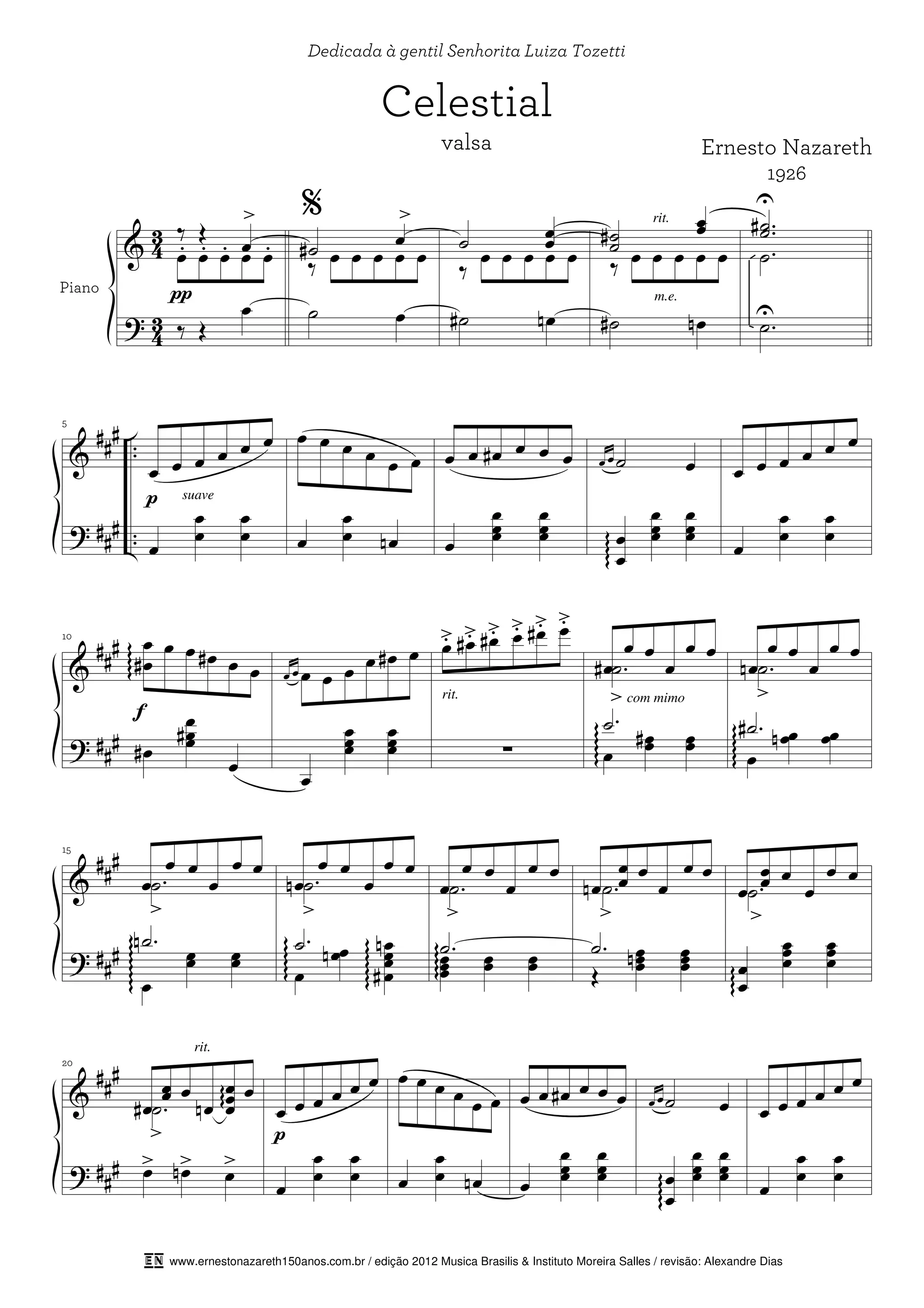 O documento é uma partitura musical dedicada à gentil senhorita Luiza Tozetti, composta por Ernesto Nazareth em 1926. Contém indicações de interpretação e notação musical específicas para piano, enfatizando a suavidade e a delicadeza na execução. Trata-se de uma obra que reflete o estilo característico e a sensibilidade do autor.