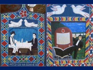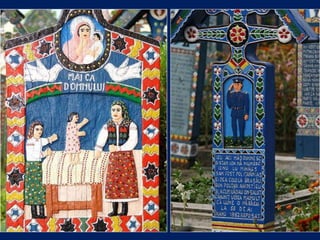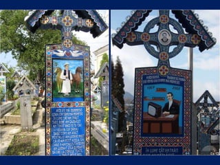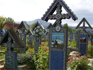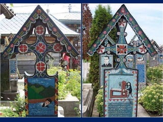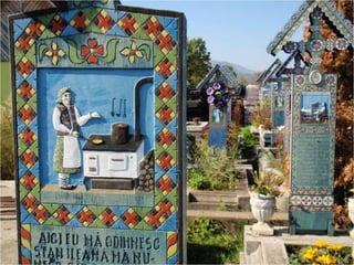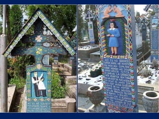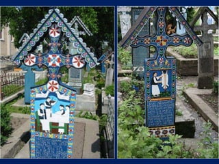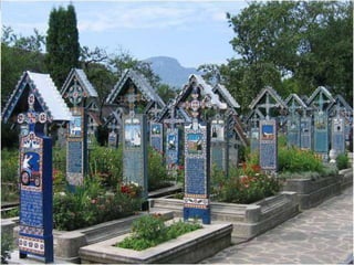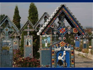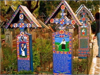Le cimetière de Sapanta en Roumanie, connu sous le nom de cimitirul vesel ou 'cimetière heureux', est célèbre pour ses tombes colorées qui présentent de manière poétique des scènes de la vie de ceux qui y sont enterrés. Ce lieu, créé par Stan Ioan Patras en 1935, est devenu un musée à ciel ouvert et une attraction touristique majeure, attirant des visiteurs du monde entier. Aujourd'hui, il est le monument funéraire le plus visité d'Europe et le deuxième au monde, juste après la vallée des rois en Égypte.