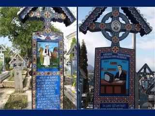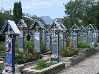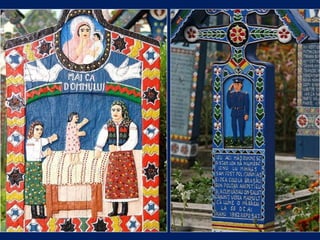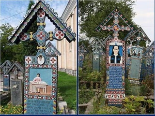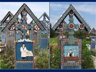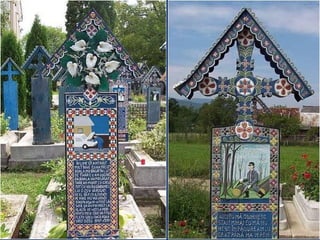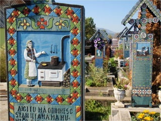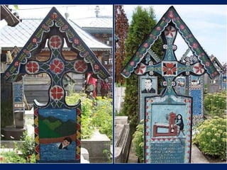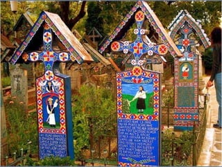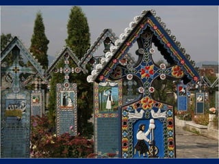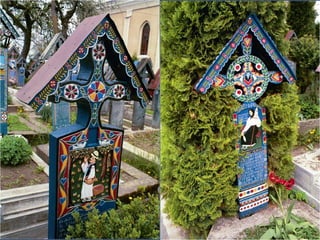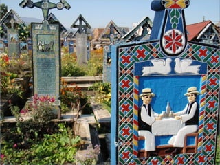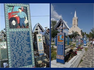 Le cimetière de Sapanta, situé en Roumanie, est connu sous le nom de Cimitirul Vesel, ou 'cimetière heureux', célèbre pour ses tombes ornées de peintures colorées représentant la vie des défunts. Ces œuvres, qui reflètent les différentes époques et les coutumes locales, ont été initiées par Stan Ioan Patras en 1935 et continuent d'attirer des visiteurs, faisant du cimetière une importante attraction touristique. Avec environ dix décès par an, la tradition se perpétue grâce à l'apprenti de Patras, Dimitru Pop.