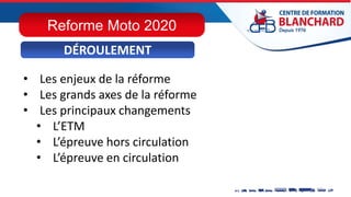 La réforme des modalités d'épreuve des permis de conduire A1 et A2 vise à renforcer la sécurité des motards en adaptant l'examen aux risques spécifiques de la conduite d'une motocyclette. Les principaux changements incluent la création d'une épreuve théorique moto, l'évolution de l'épreuve hors circulation vers un parcours « tout-en-un », et un allongement du temps pour l'épreuve en circulation, ainsi qu'un relèvement du seuil de réussite. La réforme entrée en vigueur en septembre 2020 accentue l'importance de la trajectoire de sécurité et impose des normes strictes sur l'équipement des candidats.