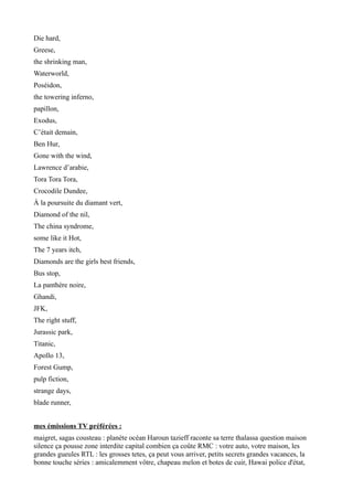Le document présente une liste variée d'artistes de musique de film, de films emblématiques et de séries télévisées préférées, ainsi que des héros et des livres, magazines et collections personnels. Il couvre différents genres et époques, illustrant les goûts culturels de l'auteur. Enfin, la diversité des références met en avant un large éventail d'intérêts allant de la musique au cinéma et à la littérature.