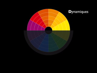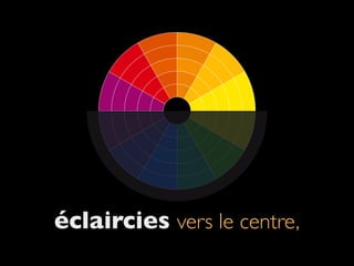 Le document explore l'utilisation des cercles chromatiques et des accords de couleurs pour améliorer les présentations visuelles, en détaillant les couleurs chaudes et froides ainsi que leurs associations. Il évoque également des concepts comme l'harmonie des couleurs sur un même rayon d'un cercle et les accords monochromes et analogues. Enfin, il mentionne des techniques spécifiques pour partages de couleurs sur des diapositives afin d'optimiser le confort de lecture.