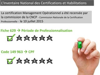 Le document concerne la certification en management opérationnel, enregistrée par la CNCP, et décrit les compétences clés nécessaires pour les managers opérationnels, ainsi que le processus d'évaluation. Il aborde également les méthodes de formation et d'accompagnement des managers et des collaborateurs pour améliorer la performance au sein des entreprises. De plus, il présente l'ISAM-IAE comme un pôle d'enseignement supérieur en gestion avec diverses offres de formations.