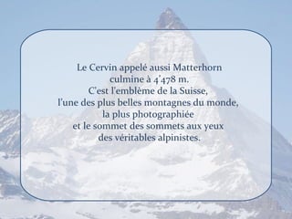Le Cervin, culminant à 4 478 m, est l'emblème de la Suisse et l'une des montagnes les plus photographiées au monde. La première ascension a eu lieu le 14 juillet 1865, marquée par un drame ayant coûté la vie à quatre alpinistes, ce qui a mis Zermatt sur la carte. La station de Zermatt, sans véhicules motorisés, offre des panoramas spectaculaires et des activités de plein air, notamment grâce à un train à crémaillère menant au Gornergrat.