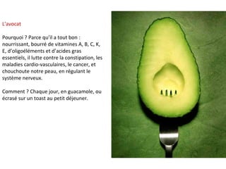 Le document présente une liste d'aliments bénéfiques pour la santé, tels que l'avocat, les œufs bio, et les noix, en expliquant leurs vertus nutritionnelles et les façons de les consommer. Il inclut également cinq règles de base pour une alimentation saine, comme prendre un petit déjeuner consistant et éviter les produits laitiers de vache. Ce guide vise à promouvoir une meilleure santé par une alimentation variée et équilibrée.