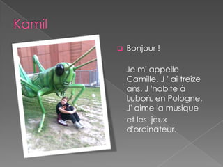 Le document présente une série de courtes introductions de jeunes habitants de Luboń et Poznań en Pologne, âgés de 12 à 13 ans. Chacun partage ses intérêts variés, notamment la musique, les jeux d'ordinateur, le sport et les animaux. Les présentations montrent une diversité de passions et d'activités, ainsi qu'une vie commune en Pologne.