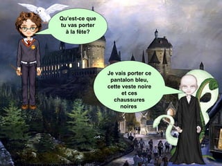 Deux personnes discutent de leurs tenues pour une fête. L'une prévoit de porter un pantalon bleu, une veste noire et des chaussures noires, tandis que l'autre opte pour un pantalon noir et un tee-shirt blanc. Les deux semblent apprécier les choix de vêtements de l'autre.