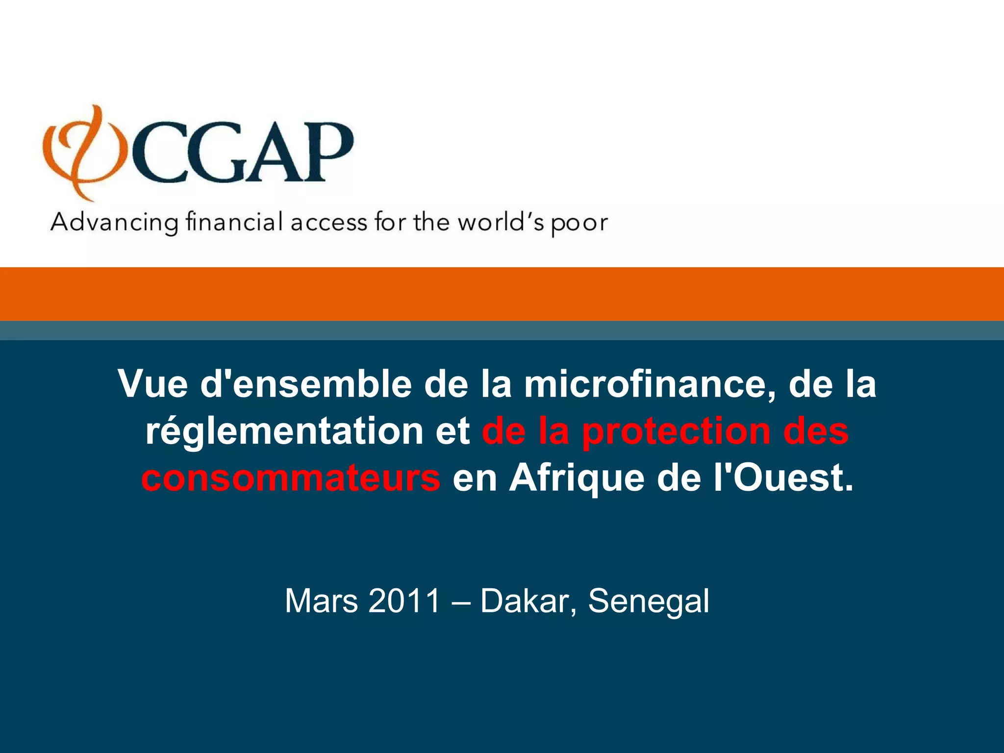 Le document présente une analyse de la microfinance, de la réglementation et de la protection des consommateurs en Afrique de l'Ouest, soulignant l'importance de la finance responsable. Il décrit les initiatives et lois adoptées dans divers pays pour garantir la transparence et l'équité dans les services financiers. Enfin, il aborde les efforts de sensibilisation et d'éducation financière pour protéger les consommateurs et améliorer leurs compétences financières.