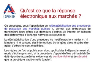 La dématérialisation des appels d'offres publics permet aux entreprises de soumettre leurs offres en ligne via des plateformes sécurisées, sans modifier le contenu ou le processus des appels d'offres. Depuis 2010, les acheteurs peuvent imposer des réponses électroniques pour les marchés de plus de 90 000 €, intégrant des obligations légales et réglementaires pour les acheteurs et candidats. Ce processus améliore l'efficacité et la compétitivité tout en nécessitant une adaptation des pratiques et des compétences au sein des entreprises.