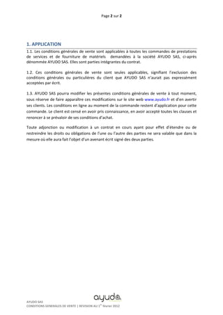 Les conditions générales de vente d'Ayudo SAS, applicables à toutes les commandes de services et de fournitures, stipulent que toute modification doit être notifiée et acceptée par écrit. Les prix sont exprimés hors taxes, et toute commande nécessite l'acceptation écrite de la société pour être valide. Par ailleurs, la société se réserve la propriété des marchandises jusqu'au paiement intégral et toute réclamation sur les factures doit être faite dans les 21 jours suivant leur réception.