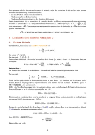Ce document traite des nombres réels, en commençant par les nombres rationnels et leur écriture décimale. Il démontre que certains nombres, comme 2, ne peuvent pas être exprimés comme des rationnels, et examine les propriétés des réels, notamment en ce qui concerne l'addition, la multiplication et l'ordre. Il souligne également l'importance de concepts mathématiques comme la densité des rationnels dans les réels et les démonstrations par l'absurde.