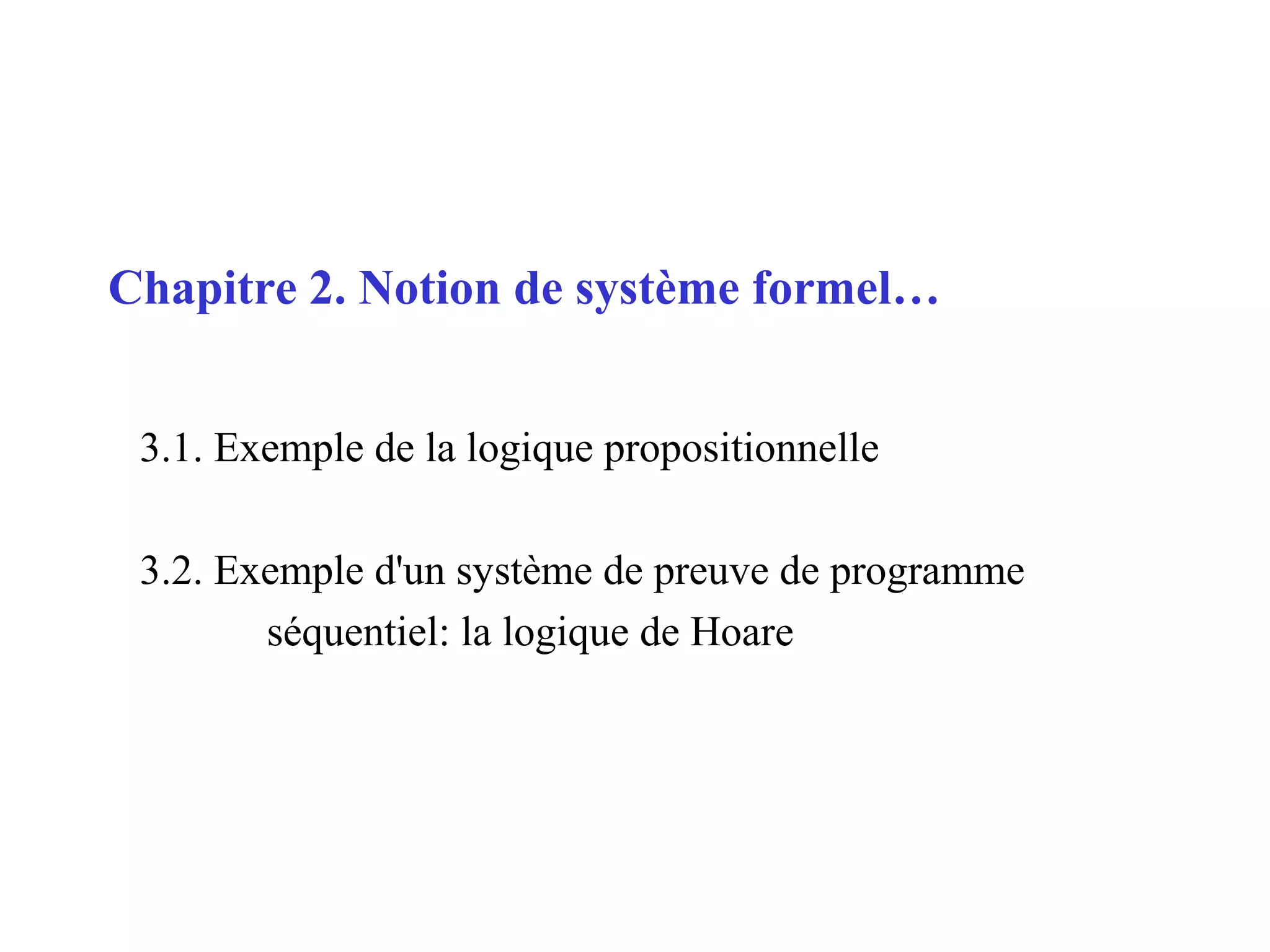 Le document traite des systèmes formels, en se concentrant sur la logique propositionnelle et la logique de Hoare, qui fournit des méthodes pour raisonner sur les algorithmes et vérifier les programmes. Il décrit la structure d'un système formel, les axiomes et les règles d'inférence nécessaires pour construire des preuves, ainsi que des applications concrètes dans l'ingénierie des systèmes. La logique de Hoare est présentée comme une technique pour associer des pré et post conditions à des actions, afin d'assurer la validité des programmes.