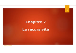 Ce document traite de la récursivité dans les structures de données et l'algorithmique, en expliquant son fonctionnement, ses définitions, ainsi que ses avantages et inconvénients. Il présente à la fois des exemples de méthodes récursives et itératives, ainsi que des types de récursivité, tels que la récursivité directe et indirecte. Enfin, il conclut sur l'importance de définir correctement la condition d'arrêt pour réussir un sous-programme récursif.