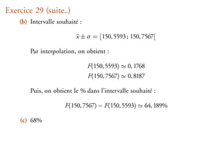 Le document présente des calculs statistiques sur une série de classes et des intervalles de valeurs. Il contient des informations sur la moyenne, l'écart type, et des résultats d'interpolation pour déterminer des pourcentages dans des intervalles spécifiques. Les résultats indiquent également que 68% des valeurs se trouvent dans l'intervalle calculé.