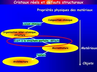 Le document traite des cristaux réels et des défauts structuraux, en expliquant comment les défauts, comme les lacunes et les dislocations, influencent les propriétés physiques des matériaux tels que l'élasticité et la conductivité. Il discute de la classification des défauts selon leur dimensionalité et de l'impact des impuretés et des alliages sur la structure cristalline. Les principes de déformation plastique et les effets des défauts sur les propriétés optiques et électriques des matériaux sont également abordés.