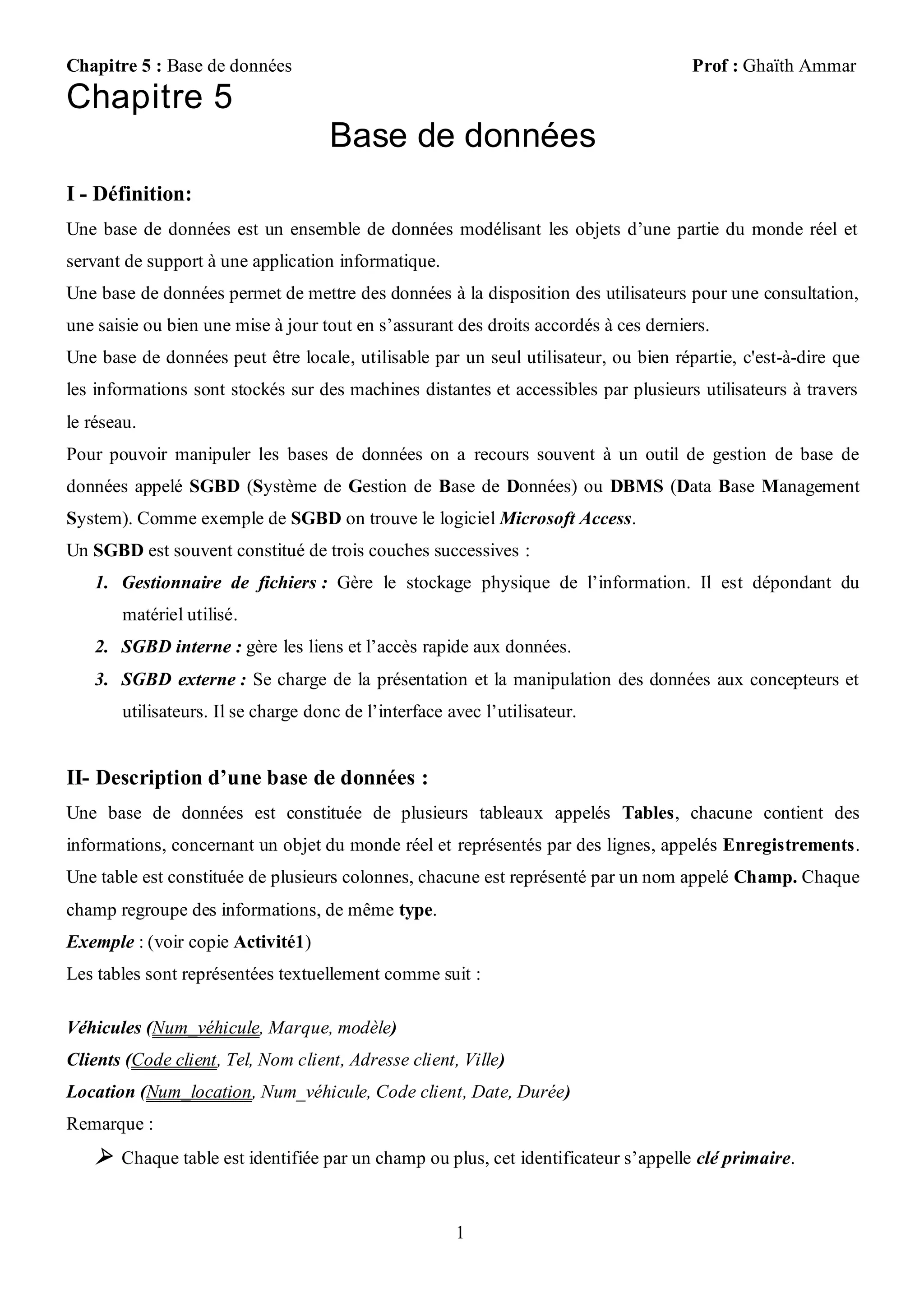 Ce chapitre définit une base de données comme un ensemble de données modélisant des objets du monde réel, accessible par divers utilisateurs. Il décrit les composants d'une base de données, tels que les tables, les relations entre elles, et l'utilisation d'outils comme les SGBD pour gérer ces données. Le document explique aussi les processus de création et de gestion des formulaires et états pour faciliter l'interaction avec les utilisateurs.