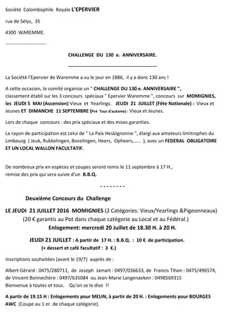 La société colombophile royale L'Epervier de Waremme célèbre son 130e anniversaire avec un challenge comprenant trois concours spéciaux. Les participants peuvent gagner des prix en espèces et trophées lors de chaque événement, avec la remise des prix prévue le 11 septembre. Les inscriptions sont ouvertes jusqu'au 19 juillet pour le concours du 21 juillet, où un barbecue sera également organisé.
