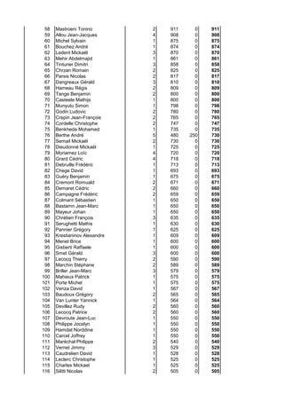 Le document présente un classement de participants basé sur le nombre de courses, les points obtenus lors des courses et les points bonus, pour un total de points. Christopher Chopin est en tête avec 7 020 points, suivi de Jawad Bouhaoui avec 4 405 points. Les données incluent les détails des scores et le classement des 241 participants.