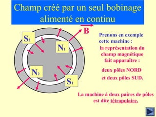 Le document traite des machines à courant alternatif, en se concentrant sur le champ magnétique généré par un bobinage alimenté en monophasé et en triphasé. Il explique comment le champ magnétique varie dans le temps et comment il tourne en fonction de l'alimentation électrique. Des exemples pratiques sont donnés, illustrant la relation entre la fréquence de rotation du champ magnétique et le nombre de pôles dans les machines triphasées.