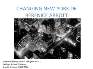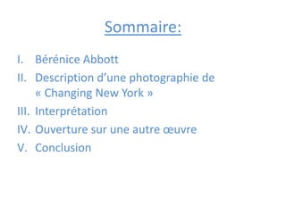Le document traite de Bérénice Abbott, photographes emblématique née en 1898 et connue pour son œuvre 'Changing New York' réalisée entre 1935 et 1939. Il décrit en détail deux de ses photographies, 'Exchange Place' et 'Construction Old and New', tout en abordant leur interprétation et leur pertinence dans la thématique de l'habitat demain. Le texte propose également une comparaison avec une autre œuvre, mais se termine sans préciser cette ouverture.