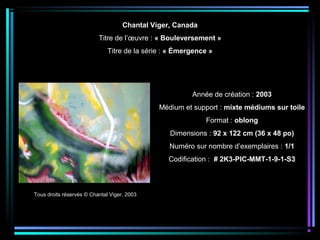 Le document présente les œuvres de Chantal Viger, créées entre 2003 et 2004, comprenant divers titres et dimensions, principalement réalisées en acrylique sur toile et en format circulaire ou oblong. Chaque œuvre est accompagnée de détails tels que la codification, le nombre d'exemplaires et les droits d'auteur. La série aborde des thèmes divers allant de l'émergence de l'identité à la culture autochtone, avec une attention particulière à l'histoire coloniale et aux problématiques contemporaines.