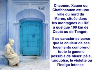 Chaouen, ou Chefchaouen, est une ville du nord du Maroc célèbre pour ses maisons peintes dans une palette de bleus, allant du turquoise à l'indigo. Située dans les montagnes du Rif, ses ruelles étroites et tortueuses, ornées d'éléments andalous, créent une atmosphère unique et colorée. La ville se distingue par son architecture harmonieuse et son ambiance vibrante, où chaque coin révèle un nouveau charme.