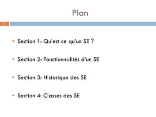 Le document présente une introduction aux systèmes d'exploitation, détaillant leur définition, fonctionnalités, et historique. Il aborde les différentes tâches de gestion que remplissent les systèmes d'exploitation, telles que la gestion des processus, de la mémoire, des fichiers et des périphériques. Enfin, il retrace l'évolution des systèmes d'exploitation depuis leur création jusqu'à leur classification actuelle.