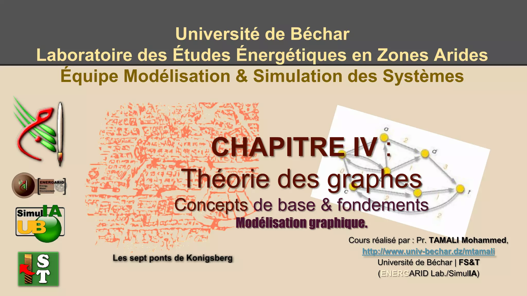 Le document présente des concepts de base sur la théorie des graphes, en mettant l'accent sur son application dans la modélisation et la simulation des systèmes, notamment en zones arides. Il décrit comment les graphes peuvent représenter des structures complexes et les relations entre des éléments variés, tout en abordant leur histoire et leur importance dans plusieurs domaines scientifiques. Enfin, le texte souligne l'importance de la méthodologie dans l'adaptation de stratégies d'observation et de modélisation pour garantir un impact réel et durable.