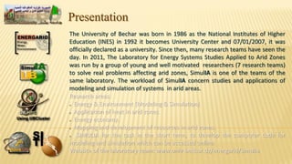 Le document présente l'Université de Béchar et son laboratoire d'études énergétiques en zones arides, soulignant ses équipes de recherche et les domaines d'application de la modélisation et de la simulation. Il décrit également les concepts clés liés aux systèmes, aux méthodes de résolution d'équations et les enjeux liés à l'évaluation des performances. Enfin, le texte aborde les outils logiciels utilisés pour la modélisation et simulation, ainsi que les défis des calculs numériques.