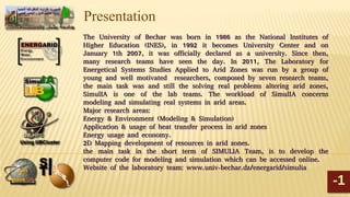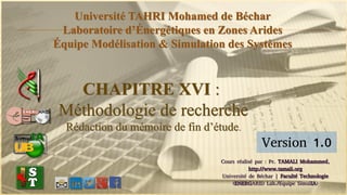 Le document présente la méthodologie de recherche pour la rédaction d'un mémoire de fin d'étude à l'Université Tahri Mohamed de Béchar, mettant en lumière l'importance de la qualité de la rédaction pour l'image des étudiants et encadreurs. Il aborde des concepts fondamentaux comme l'approche systémique, la théorie des systèmes, et les caractéristiques des systèmes, ainsi que le rôle de la modélisation dans la simulation de systèmes en zones arides. Enfin, il souligne la pédagogie et la didactique en tant que processus d'explicitation des savoirs dans un cadre académique.