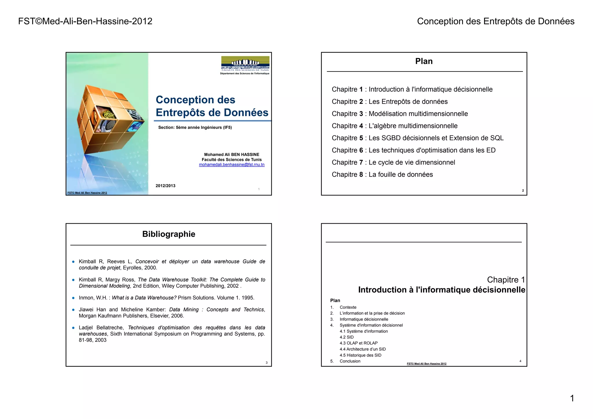 Le document présente une étude sur la conception des entrepôts de données, abordant l'informatique décisionnelle, les systèmes d'information décisionnels, et les techniques de modélisation multidimensionnelle. Il souligne l'importance de la prise de décision stratégique et tactique au sein des entreprises, tout en identifiant leurs besoins face à la masse de données à traiter. Les chapitres suivants traitent de la gestion des données, de la fouille de données, et des outils d'analyse pour optimiser la prise de décision.