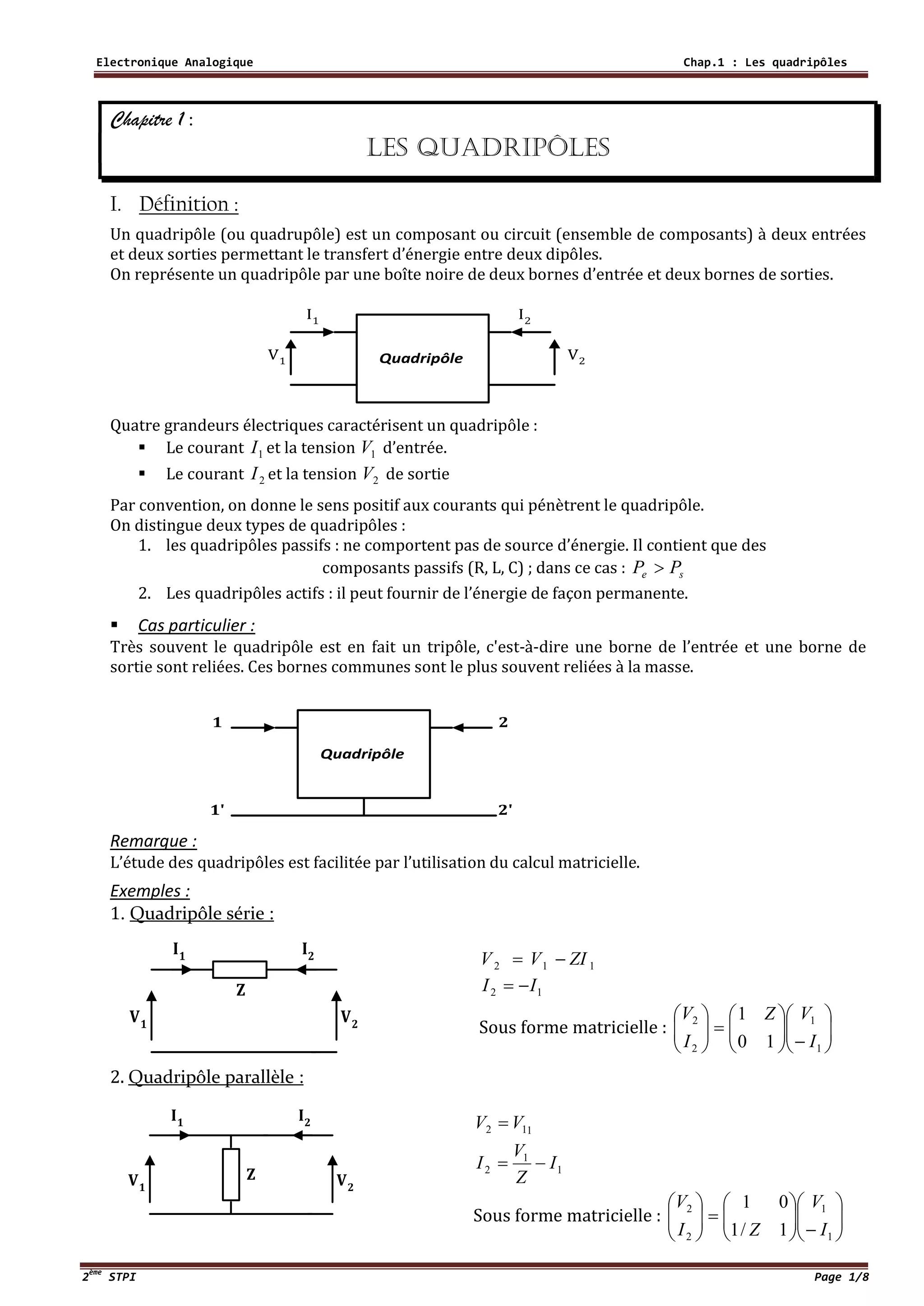 Le document traite des quadripôles, des composants électroniques caractérisés par deux entrées et deux sorties, permettant le transfert d'énergie. Différents types de quadripôles, passifs et actifs, sont décrits ainsi que leurs représentations matricielles, notamment en utilisant des matrices d'impédance, d'admittance et hybrides. Des propriétés, associations et calculs des matrices représentant les quadripôles sont également abordés, facilitant leur analyse dans divers circuits.