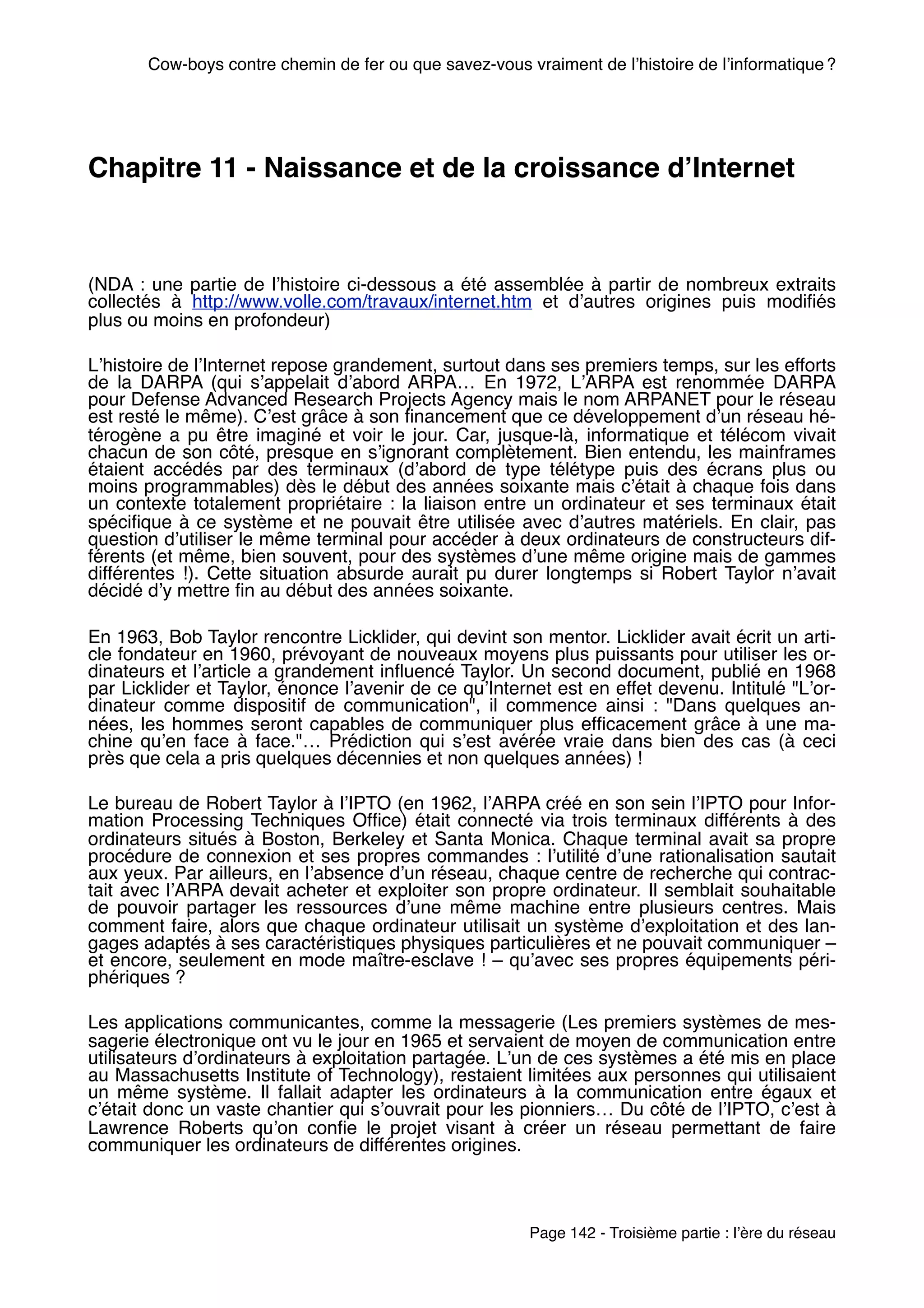 Le chapitre 11 aborde l'histoire de l'Internet, soulignant le rôle crucial de la DARPA dans son développement initial et l'évolution des technologies de communication. Il détaille la transition de connexions propriétaires à un réseau capable de relier différents types d'ordinateurs grâce à l'innovation des IMPs et à la commutation de paquets. Finalement, il retrace la mise en place d'ARPANET, le précurseur d'Internet, et les défis rencontrés lors de son déploiement.