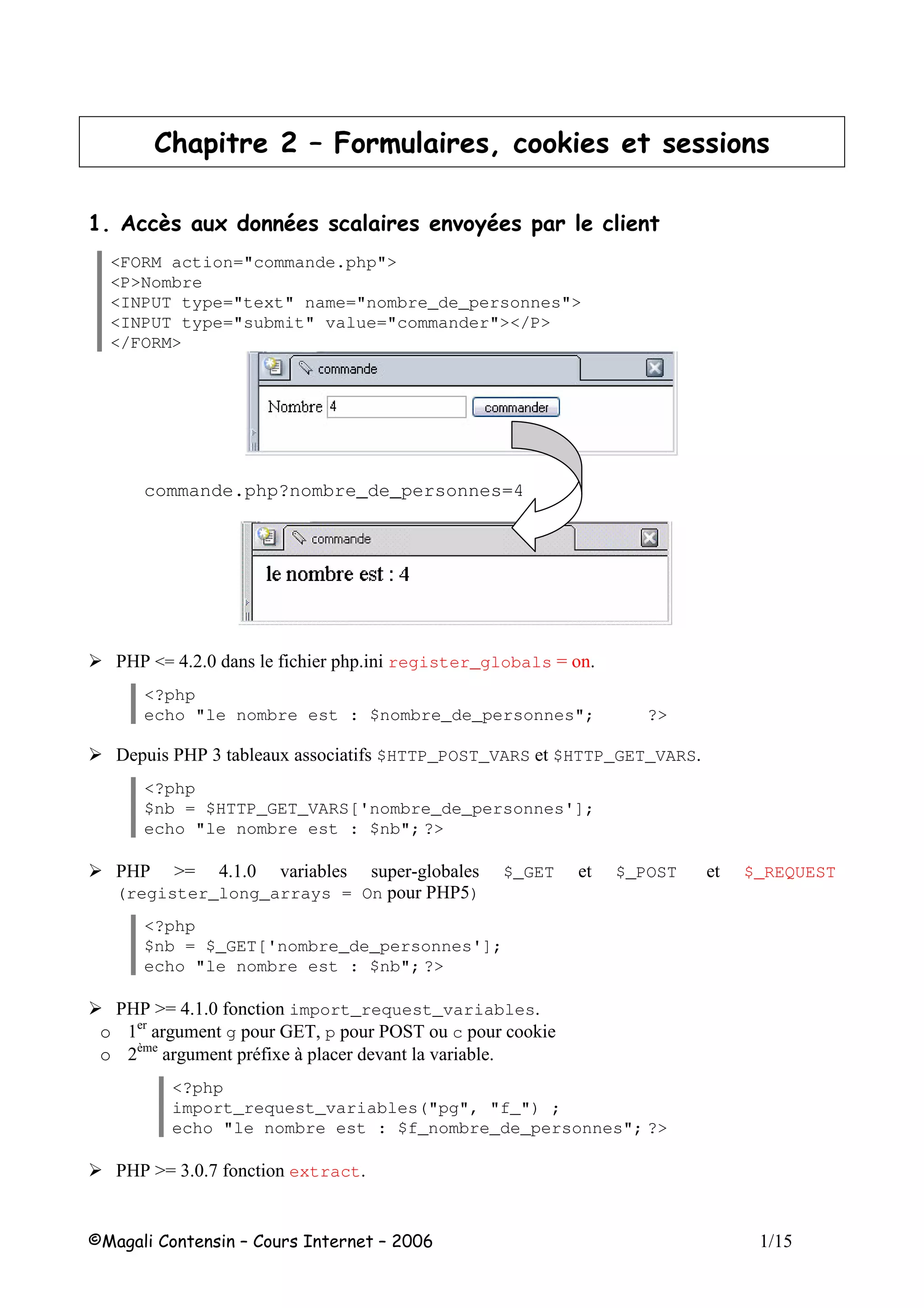 Le document décrit un ensemble de scripts PHP pour gérer des commandes et des sessions utilisateur dans un environnement web. Il aborde la collecte d'informations via des formulaires, la gestion des cookies, l'ouverture et la fermeture de sessions, ainsi que l'enregistrement et la consultation de données de session. Le code inclut des exemples pratiques sur la façon d'implémenter ces fonctionnalités en PHP.