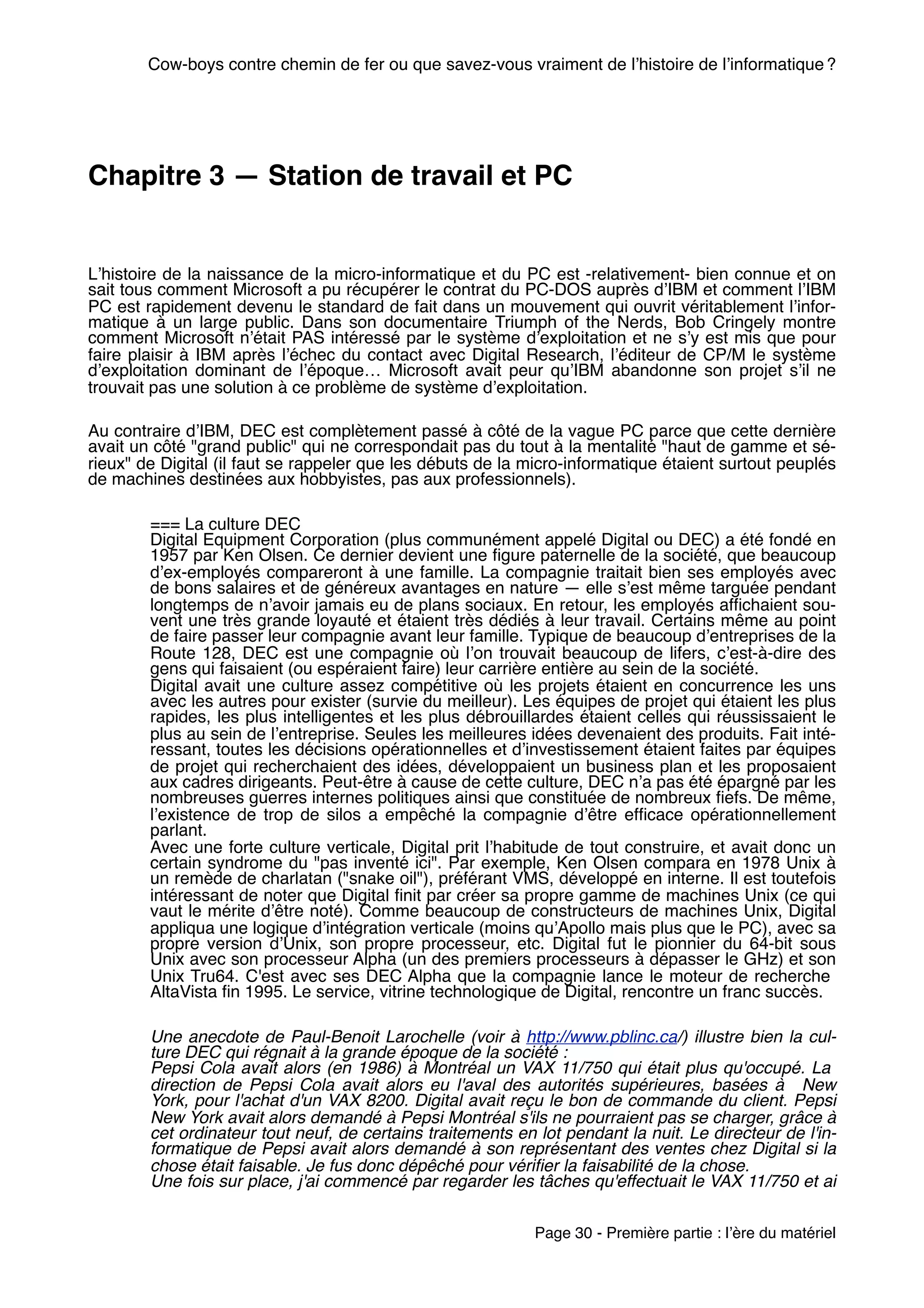 Le chapitre 3 traite de l'émergence de la micro-informatique et des PC, en soulignant comment Microsoft a capturé le marché avec son contrat d'exploitation sur le PC-DOS, malgré une vision initiale différente. Il met également en lumière la culture d'entreprise de Digital Equipment Corporation (DEC), fondée par Ken Olsen, qui a réussi grâce à une loyauté des employés exceptionnelle, mais a souffert de l'absence d'une planification de succession efficace après son départ. Enfin, le chapitre aborde l'évolution des stations de travail dans les années 80, marquée par une concurrence intense entre DEC, Apollo et Sun Microsystems.
