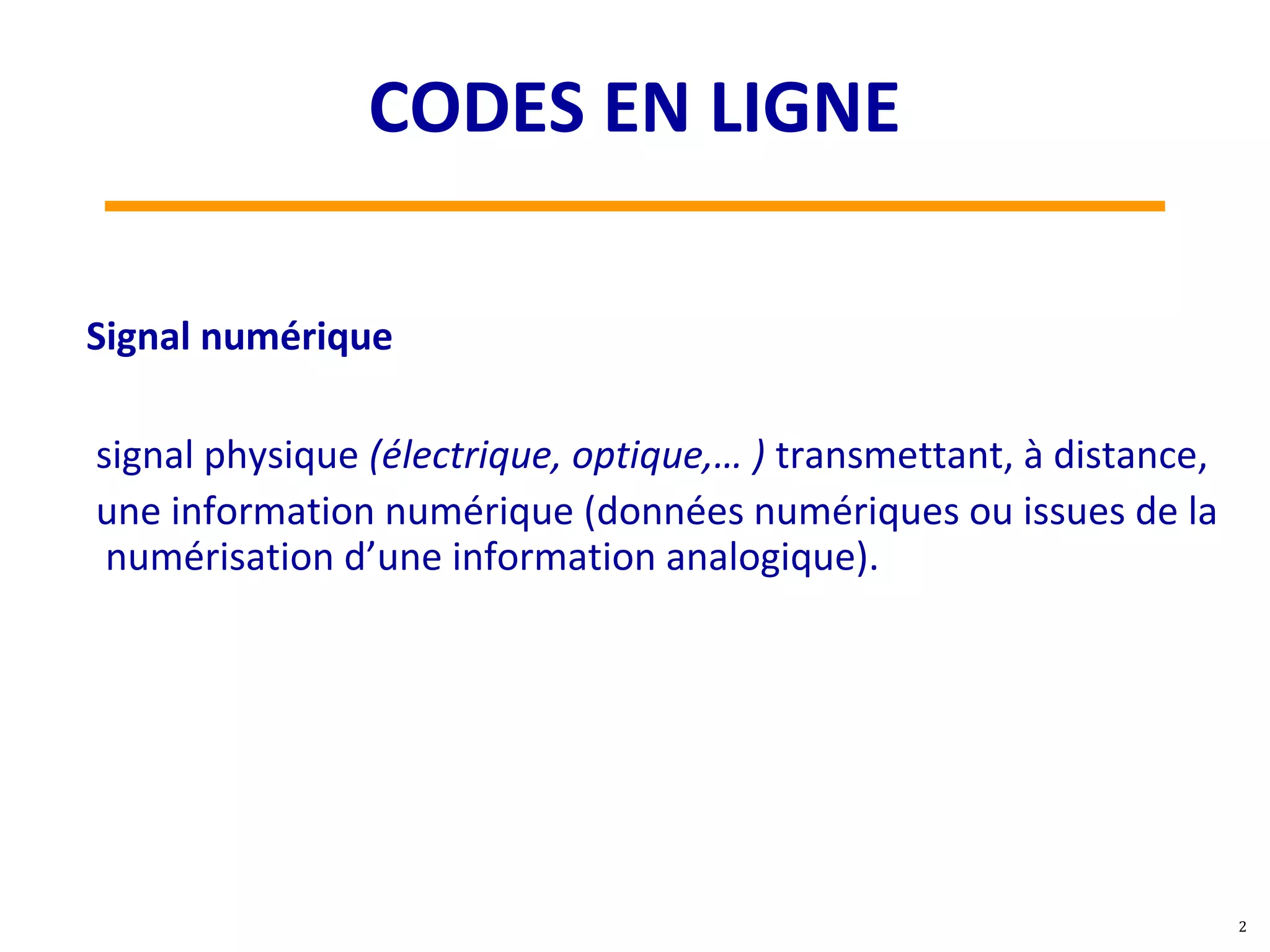Le document traite des codes numériques en ligne et de leur rôle dans la transmission d'informations numériques. Il décrit différents types de codage binaire, notamment le codage source et de canal, ainsi que plusieurs codes utilisés, tels que NRZ, Manchester et Miller, en mettant en avant leurs caractéristiques et avantages. L'accent est mis sur l'importance de l'adaptation des signaux numériques aux caractéristiques de transmission et sur les qualités idéales d'un code.