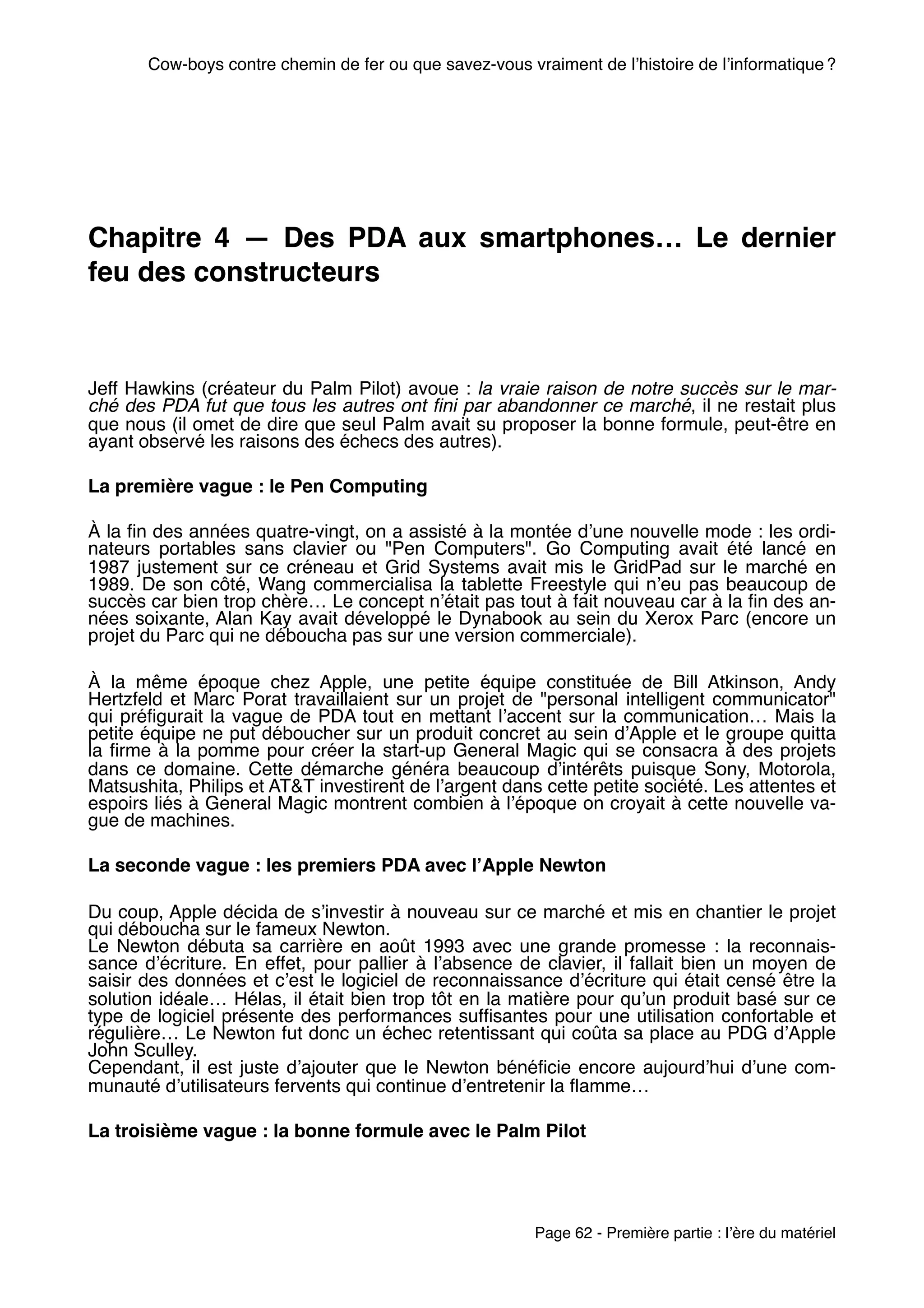 Le chapitre 4 explore l'évolution des PDA vers les smartphones, mettant en lumière le succès de Palm Pilot en raison de son expérience utilisateur et de ses fonctionnalités précises. Tandis que des échecs comme l'Apple Newton et la stratégie maladroite de Microsoft illustrent les défis d'innovation, le Blackberry et l'iPhone émergent comme des produits incontournables en répondant aux besoins des utilisateurs en matière de convergence et de simplicité. La stratégie de Palm a été compromise par un manque d'innovation face à la montée de Microsoft et d'autres compétiteurs.