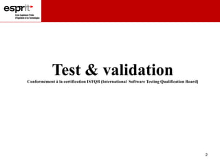 Le document traite des techniques de test et de validation conformément à la certification ISTQB, en abordant le processus de développement des tests, les catégories et techniques de conception. Il explore les techniques basées sur les spécifications (boîte noire) et celles basées sur la structure (boîte blanche), ainsi que des méthodes pratiques telles que les tests exploratoires. Enfin, il souligne l'importance de choisir les techniques en fonction de divers facteurs comme le type de système, les exigences et les risques associés.