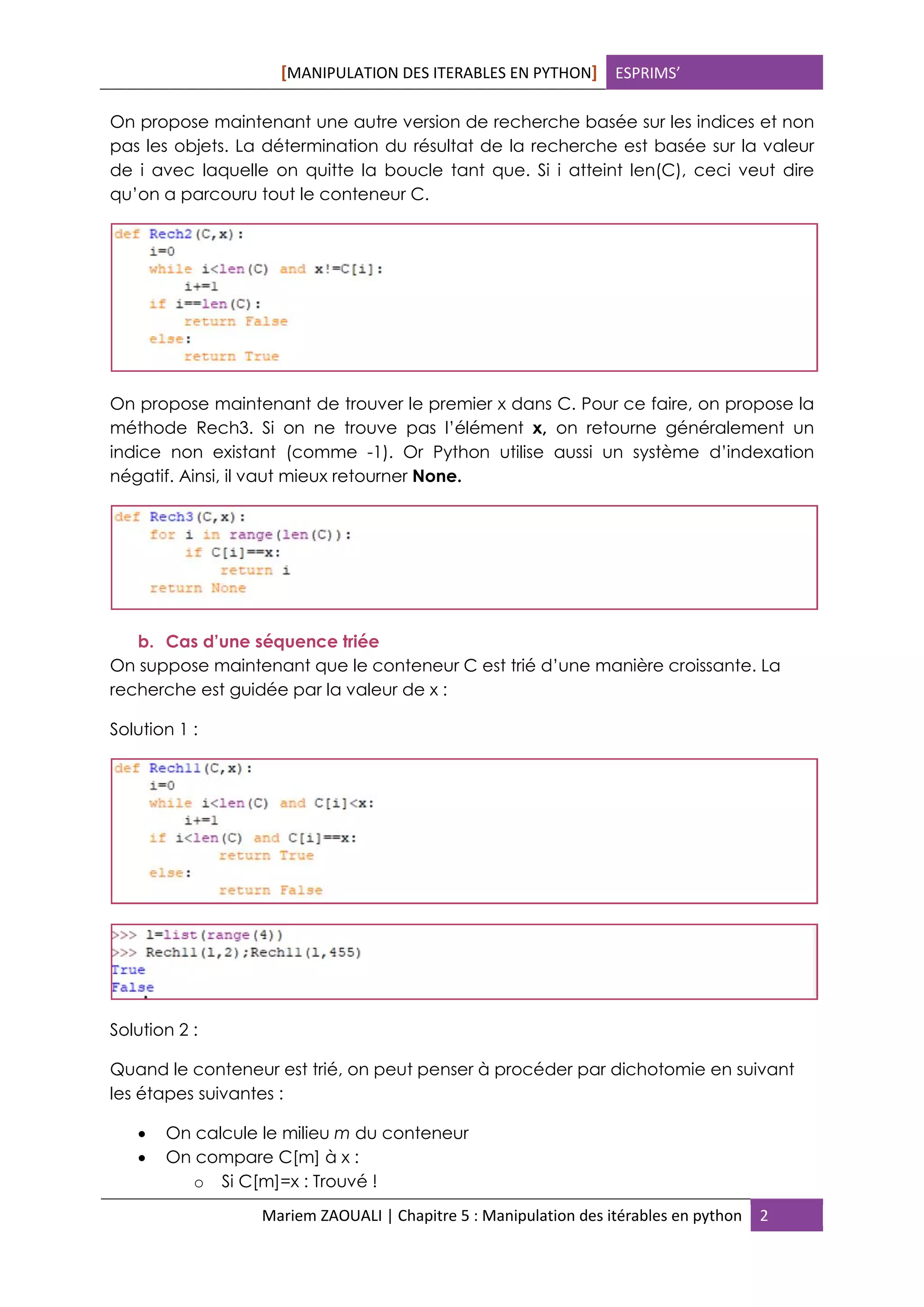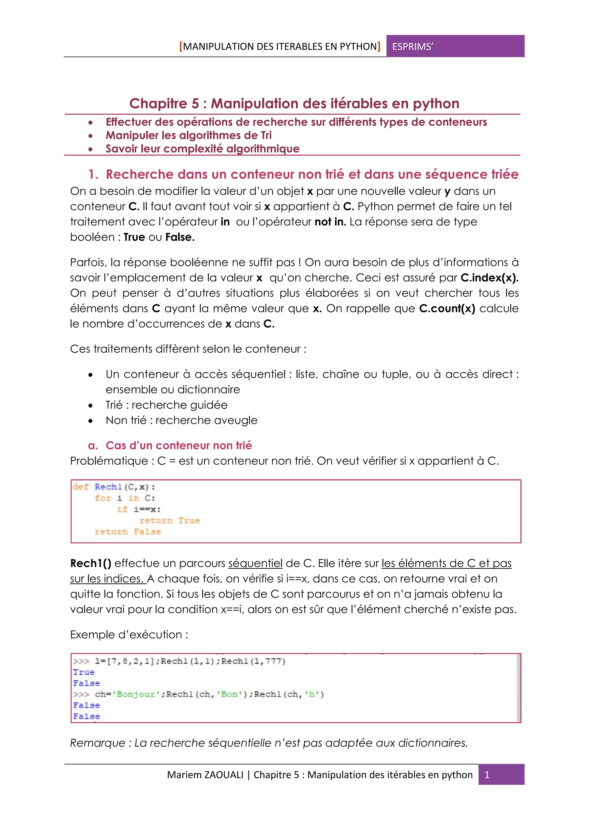 Le chapitre 5 aborde la manipulation des itérables en Python, en se concentrant sur les opérations de recherche dans des conteneurs triés et non triés, ainsi que sur les algorithmes de tri tels que le tri par sélection, par fusion et rapide. Il examine également la complexité algorithmique associée à ces opérations, fournissant des exemples et des explications sur les méthodes de calcul des coûts d'exécution. Les résultats permettent de comprendre les performances des algorithmes en fonction de la taille des données et des types de conteneurs.