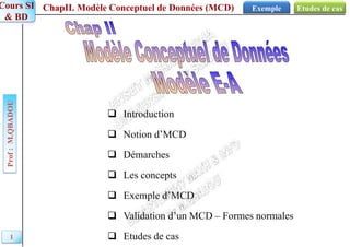 Le document présente un modèle conceptuel de données (MCD) en décrivant les étapes de construction d'une base de données, les concepts fondamentaux tels que les entités, associations et propriétés, ainsi que les démarches pour obtenir un MCD. Il souligne l'importance de traduire les besoins utilisateurs en structures de données correctes, efficientes et normalisées et offre un exemple concret de modélisation pour une société de travail intérimaire. Enfin, il inclut des critères pour la validation d'un MCD et l'analyse des besoins des utilisateurs.