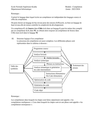 Le document présente un module sur la compilation, détaillant l'évolution des langages de programmation depuis le langage machine jusqu'aux langages évolués tels que C et Java. Il décrit le processus de compilation qui transforme ces langages en code exécutable, en introduisant des concepts comme l'analyse lexicale, syntaxique, sémantique, et la génération de code. Plusieurs phases de compilation sont expliquées, y compris l'optimisation de code et le traitement des erreurs.