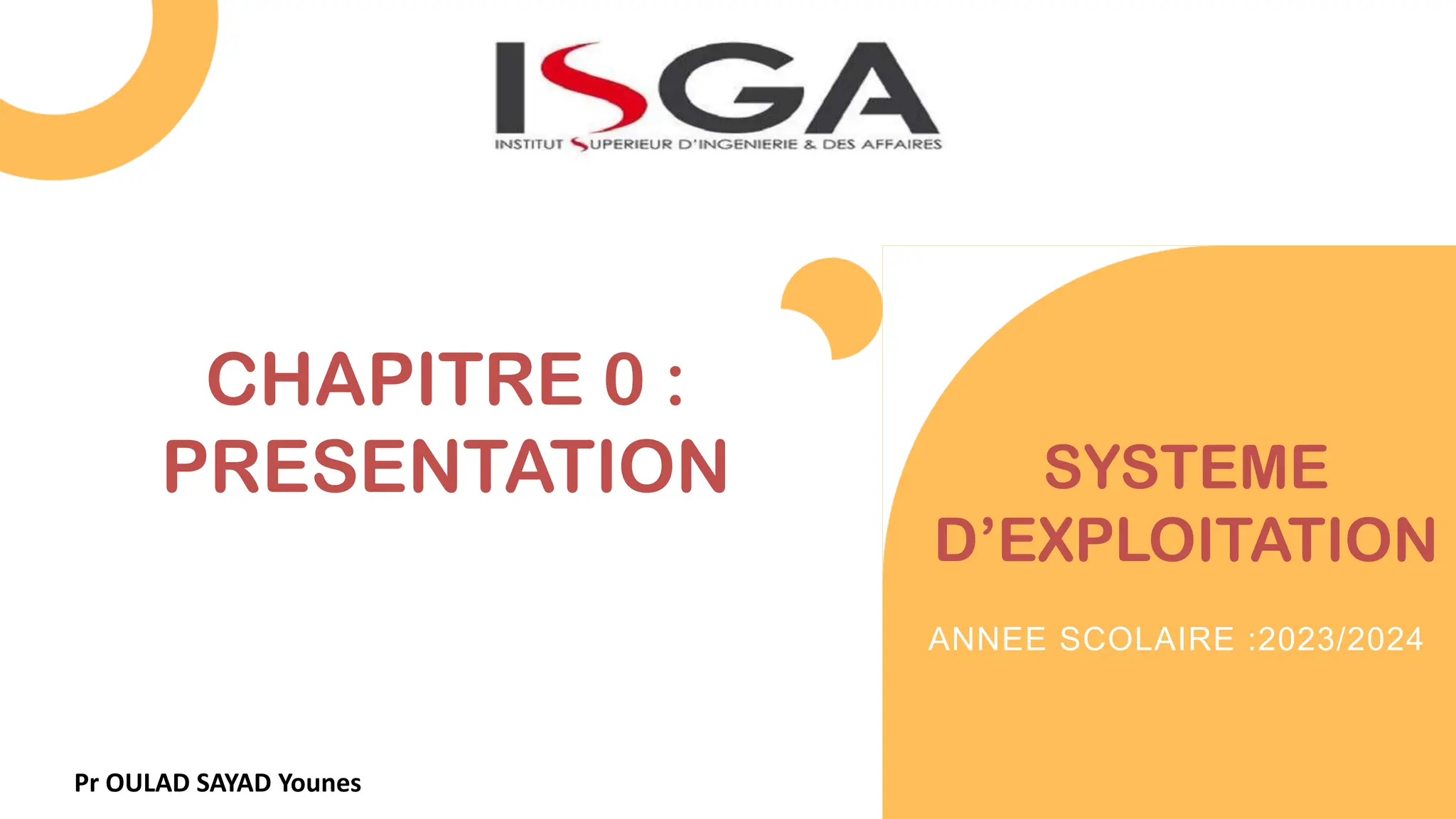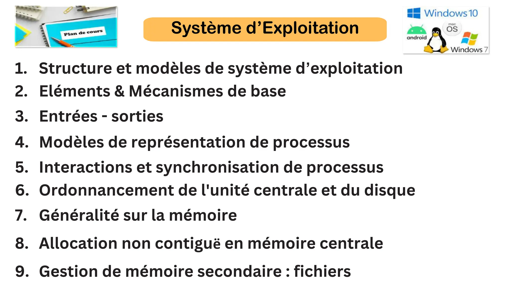 Le document présente le programme de l'année scolaire 2023/2024 pour le cours de systèmes d'exploitation, détaillant les thèmes abordés tels que la structure des systèmes, la gestion de la mémoire, et l'ordonnancement. Il inclut également des travaux pratiques sur le matériel informatique, la configuration des réseaux TCP/IP et le dépannage. Les évaluations se basent sur un système de notes réparti entre le module théorique, les travaux pratiques et l'assiduité.