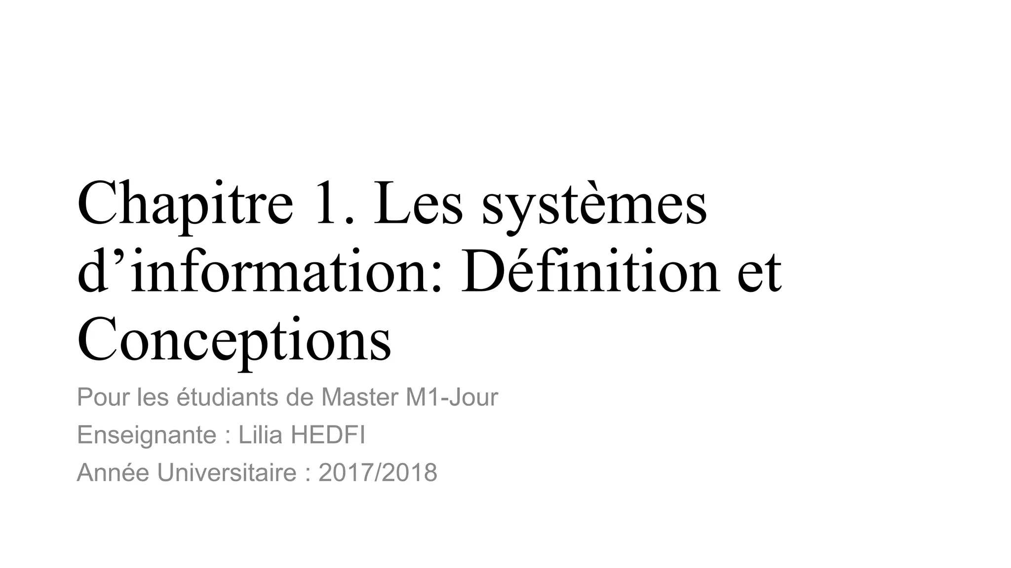 Chapitre 1. Lessystèmes d’information: Définition et Conceptions Pour les étudiants de Master M1-Jour Enseignante : Lilia HEDFI Année Universitaire : 2017/2018
